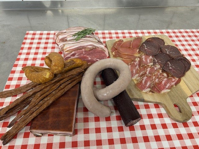 Nakkefilet snøret med bacon, medister, karry pølser, tapaspakke, ølpinde og spegepølse